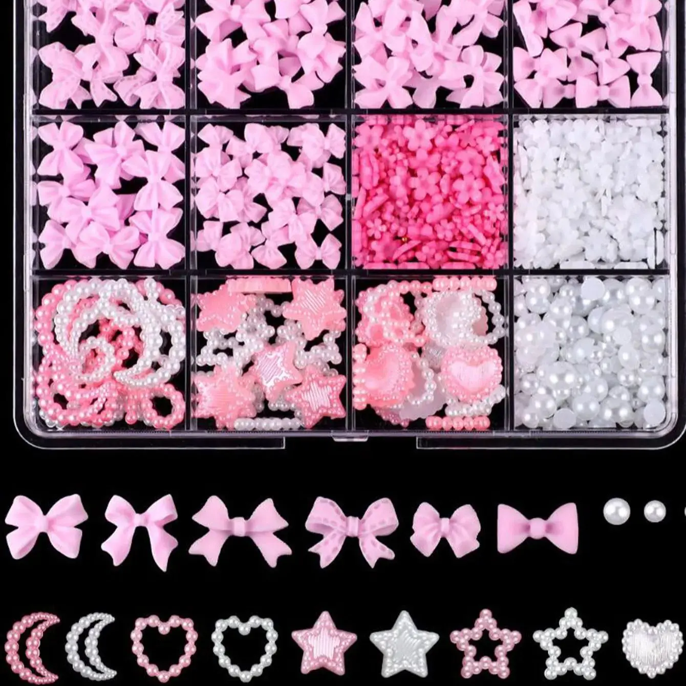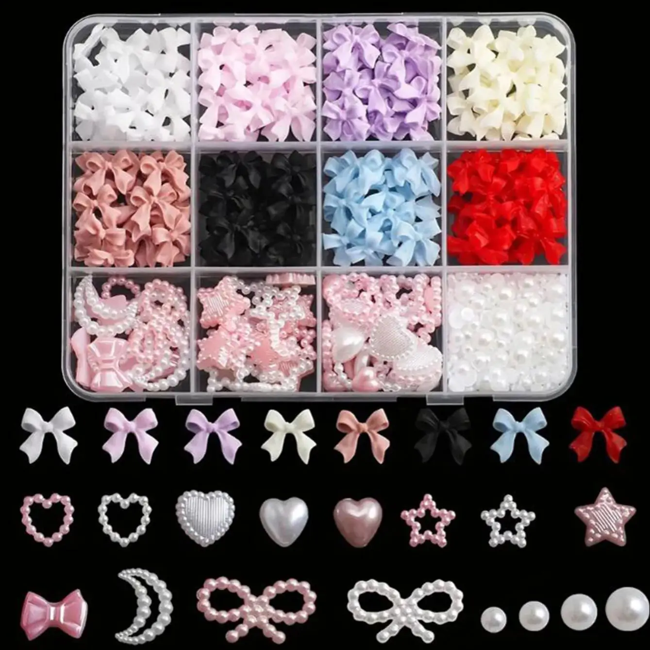 Elevate your nail art game with our 12Grids 3D Mixed Resin Bow, Star, and Moon Nail Charms. These unique decorations allow you to create eye-catching designs that stand out.