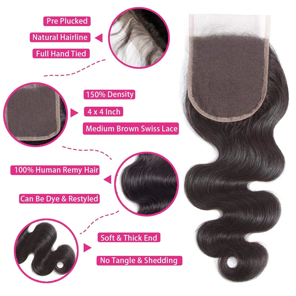 Elevate your hairstyle with our Body Wave 100% Human Hair Bundles with Closure. Perfect for those who desire a luxurious, natural look, these bundles come with a 4x4 free part lace closure that ensures versatility in styling.