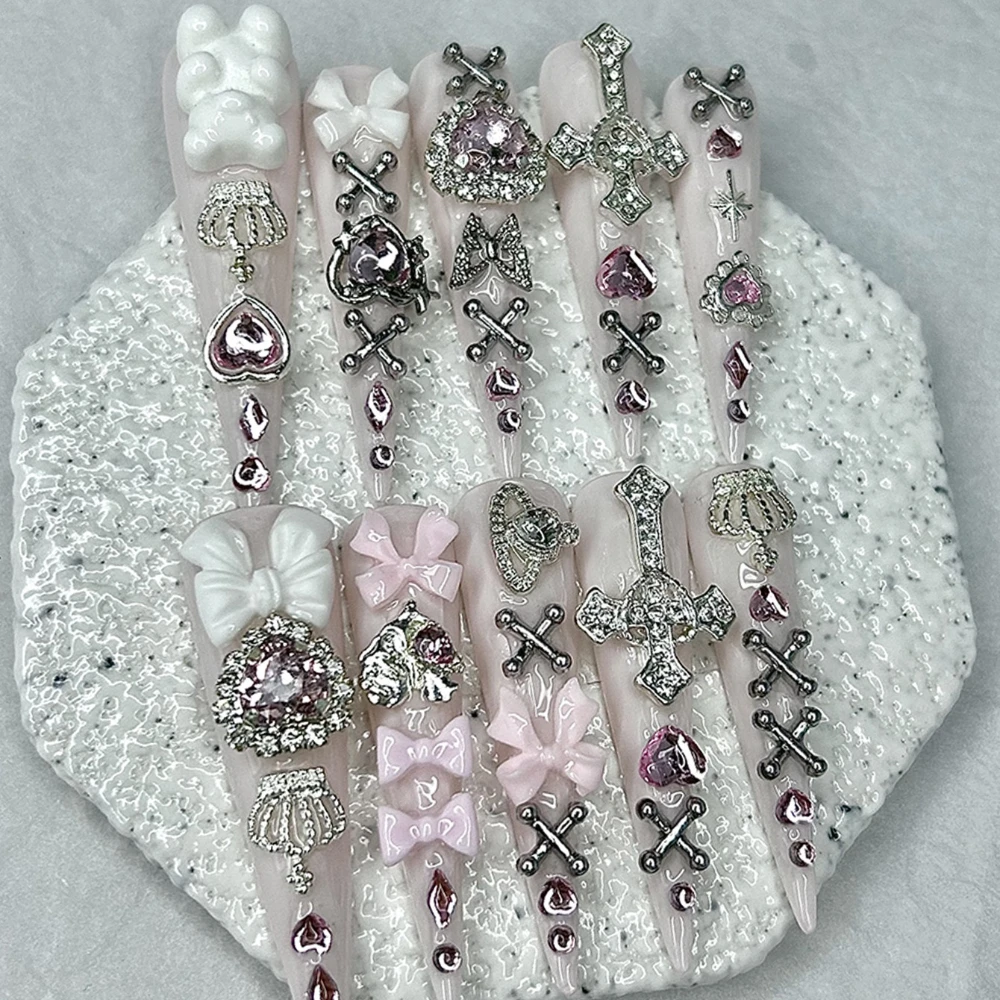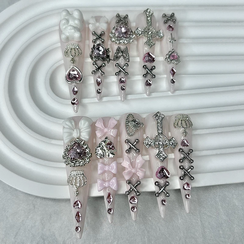 Get ready to embrace the Y2K trend with our 10PCS Y2K Pink Jirai Cute Long Handmade Press On Nails. These stiletto-shaped nails are adorned with charming designs that include bows, hearts, and crowns.