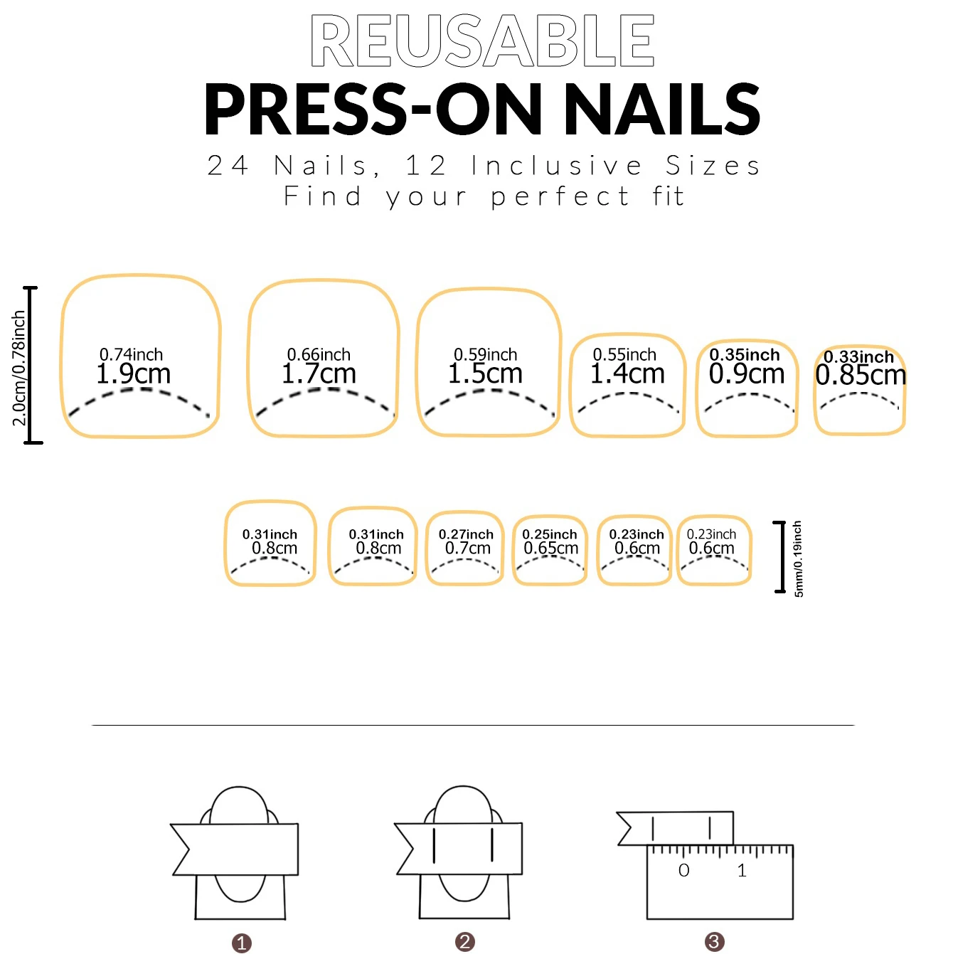 To apply, start with clean and dry toenails. Select the appropriate size for each toe, apply adhesive, and press down firmly. Enjoy your stylish, salon-quality look in minutes!