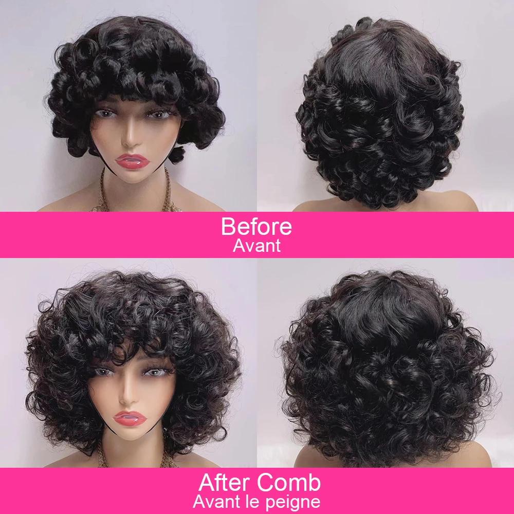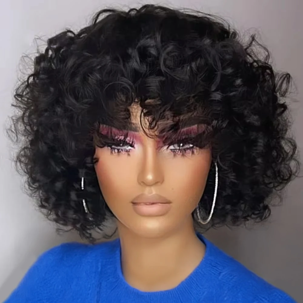 Elevate your style with our Funmi Curly Full Machine Made Short Bob Wig with Bangs. Perfect for an easy and chic transformation.
