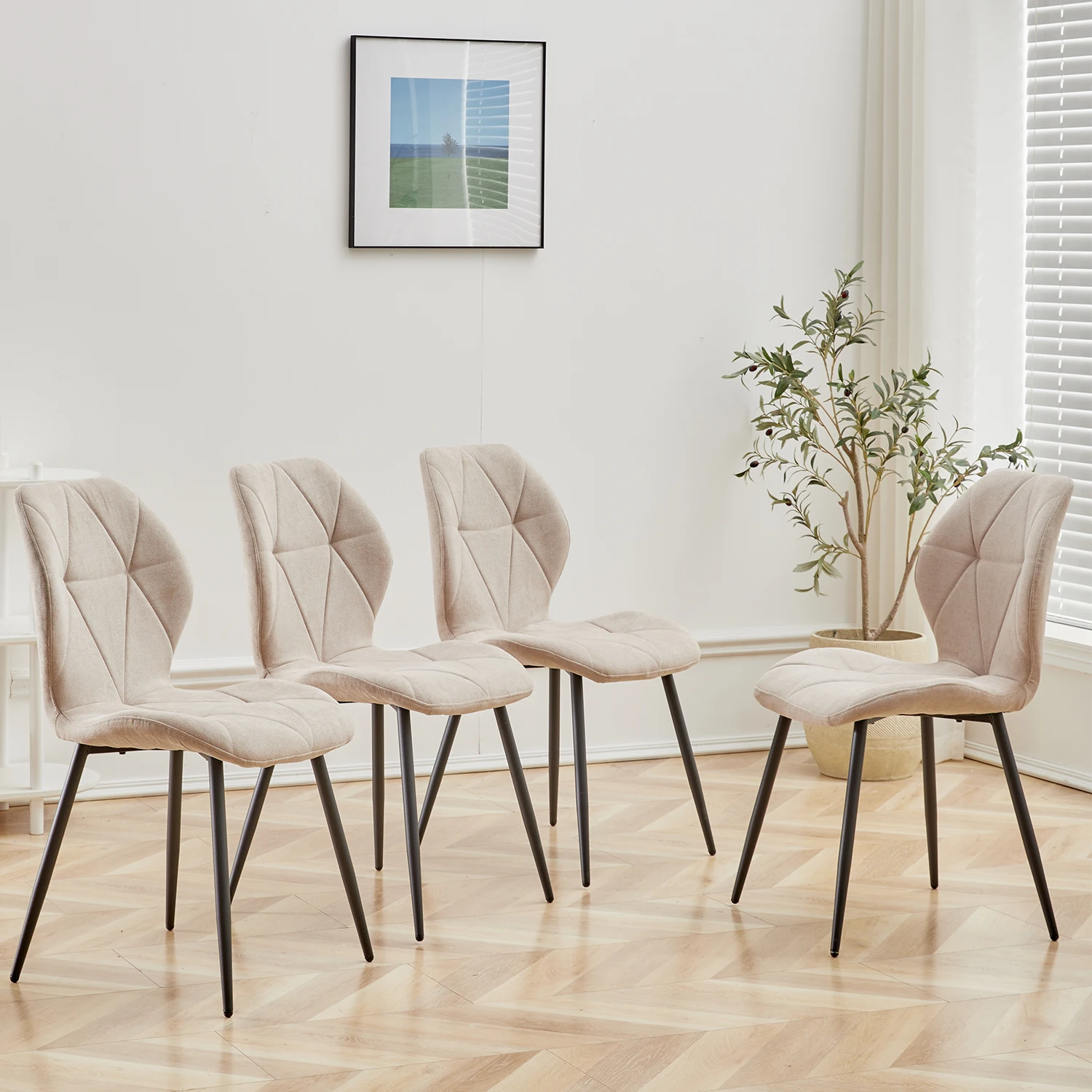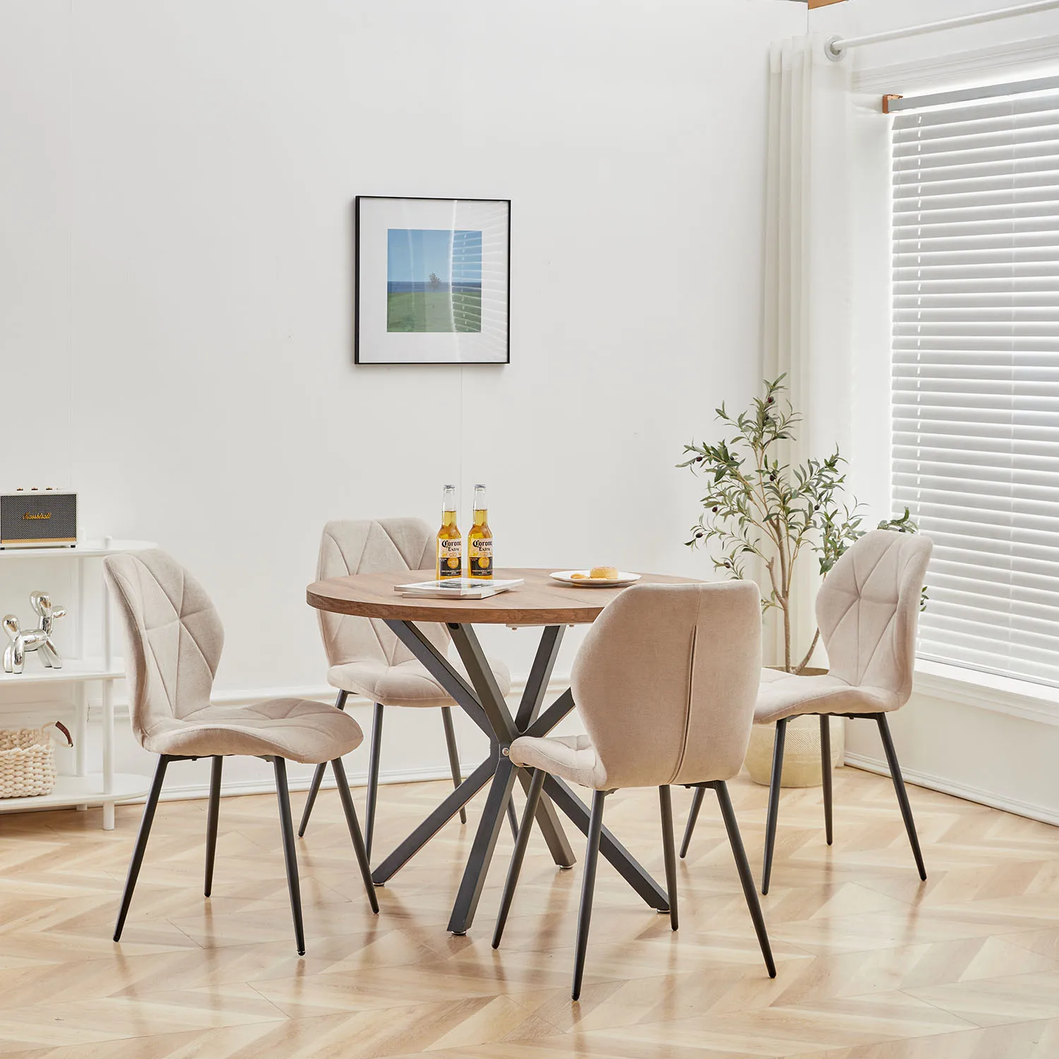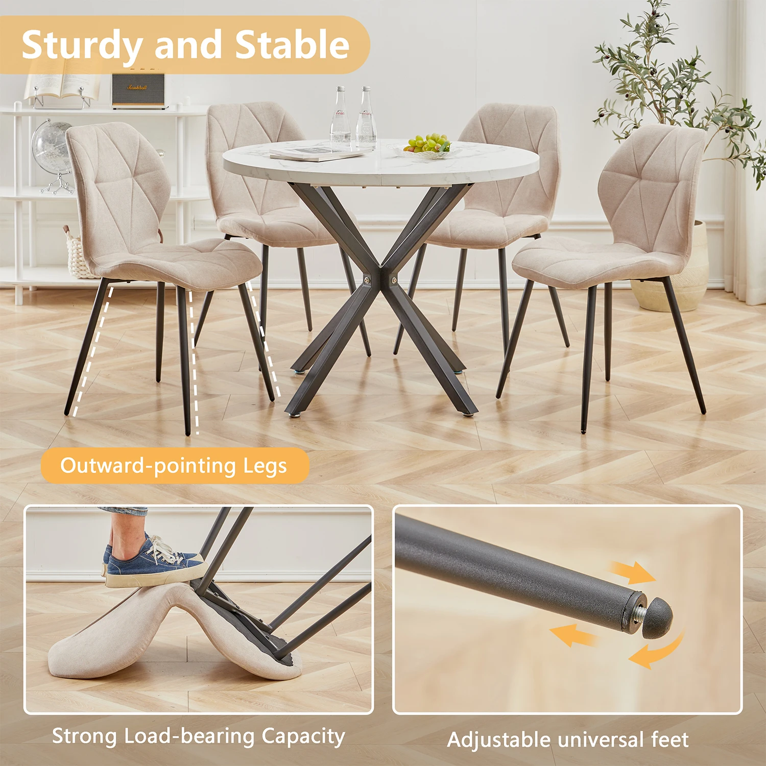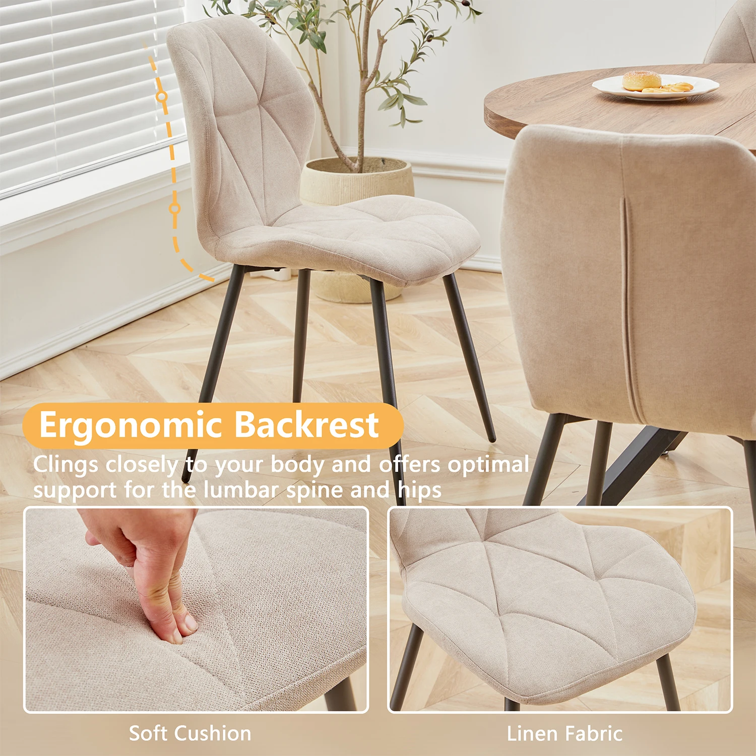 With their padded linen fabric and sleek metal legs, these chairs complement any decor style, from modern to classic. The soft upholstery ensures comfort, allowing you and your guests to relax and enjoy your meals.